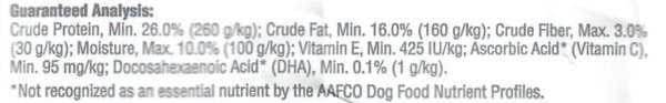The Guaranteed Analysis lists the minimum amounts of certain ingredients such as protein and fats and the maximum amounts of moisture and fiber. The protein and fat levels are listed on the label in an “as-is” basis which includes water. It does not tell you what the protein sources are or whether the protein is of animal or plant origin.