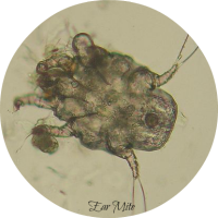 Although it is nearly impossible to see these mites, an inexpensive otoscope that can be purchased over the counter will reveal tiny white specks among the black debris. You can also see these little creatures by removing a sample of the ear wax using cotton tipped applicator and viewing it under a magnifying glass or microscope. If you do this, you will want to place the cotton tipped applicator on a black surface such as a piece of black construction paper. |