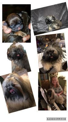 Teddys coat color changed so much over the 18 months of his life. He has never been clipped other than trimming has face and sanitary clippings. His underbelly and legs are cream , with his back , tail and face sporting gorgeous black, silver and gold. Collage pics are birth to 1yo. Single pic is current, he just turned 2 , the end of January